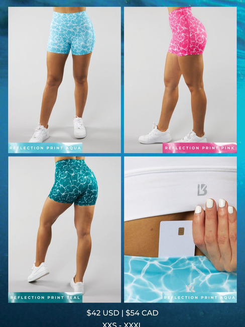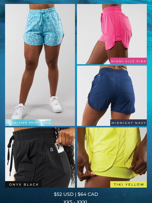 Flo Shorts - Reflection Print Blue, Onyx black, Miami vice pink, Midnight Navy, Tiki Yellow ($52)